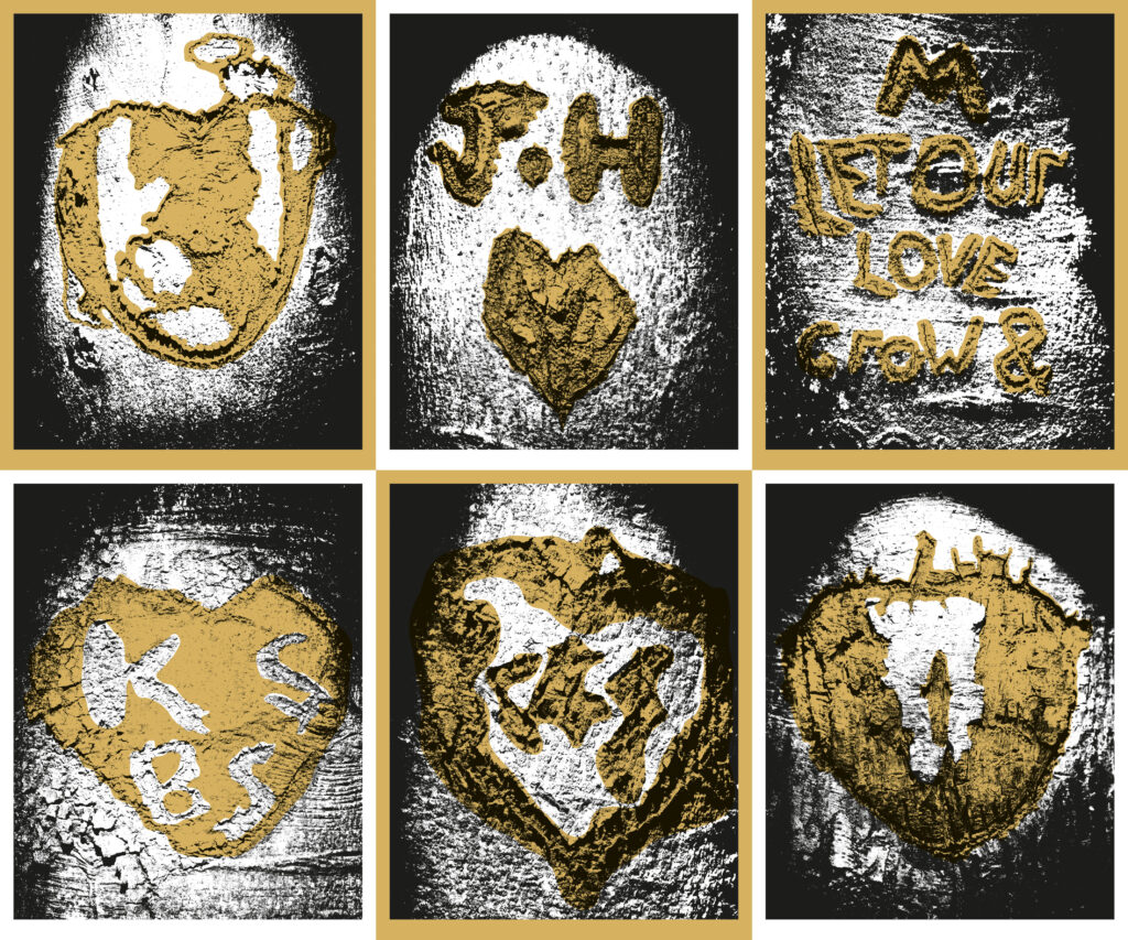 For over 5 years I have been photographing the love declarations carved on the trees in Epping Forest, and I now have over a thousand of them. I then colour and print them in various ways, as they remind me of the colourful Loveheart sweets from childhood. The hearts start out perfectly carved by romantic couples but over time the bark starts to heal in unpredictable ways, and what’s left is often as messy as the love affairs themselves.